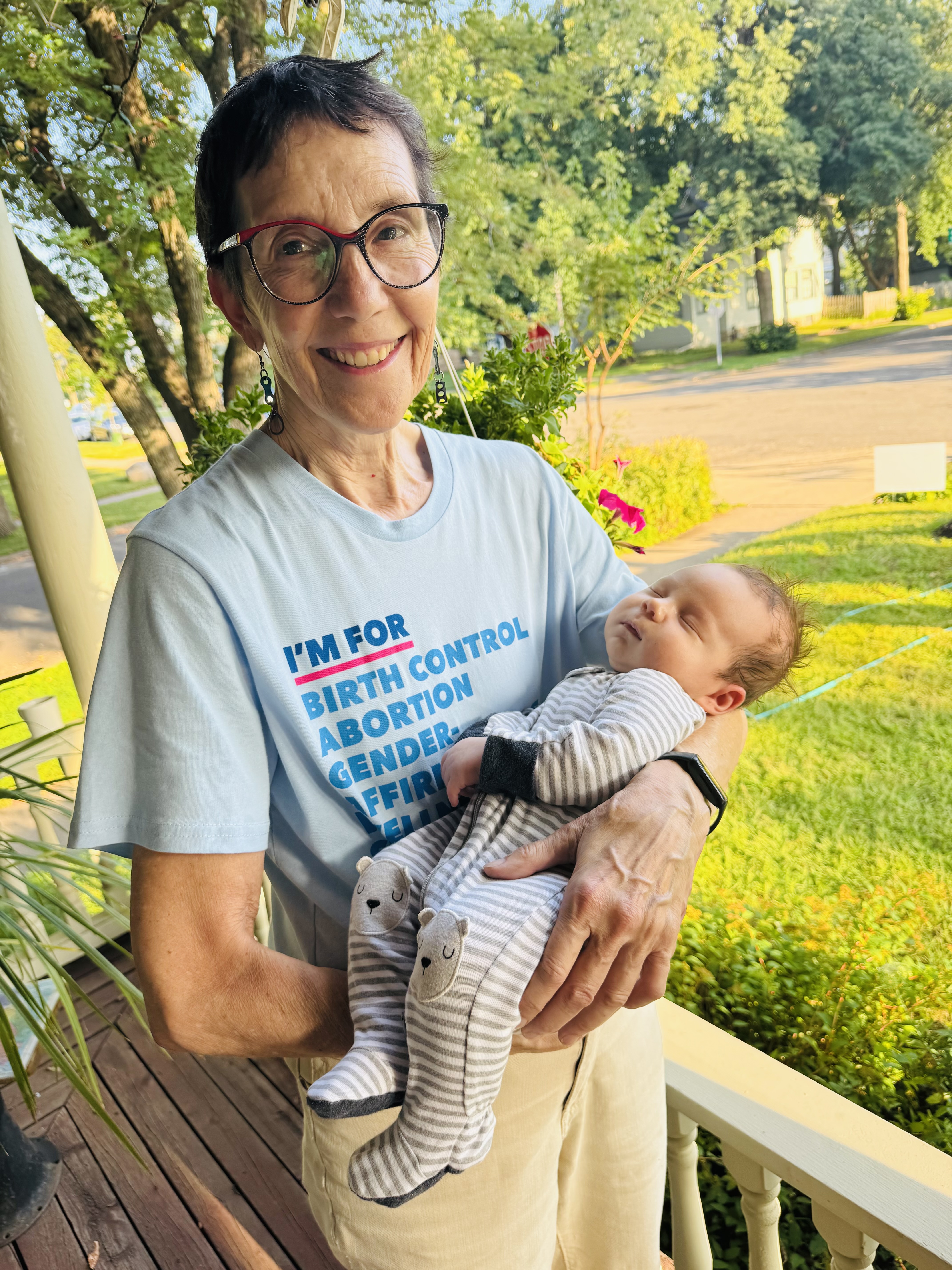 More significant than what others thought of me is how the T-shirt made me feel. I wore it home, forgot to change and let my husband take a photo of me holding our infant grandson beneath the words “I’m for abortion.” After that, I just gave the shirt away.