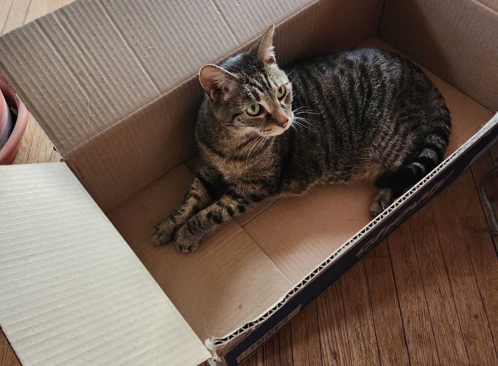 That struck me as hyperbole until I realized, some days later, that I had begun to stop every week at an Aldi on my way back from Meals on Wheels because the store carries affordable cans of tuna that the cat will eat. Q.D. likes to go outside early in the morning, and so even if I have work or other chores to do, I now station myself at the table by the back door so I can hear his meow when he wants to come back in.
